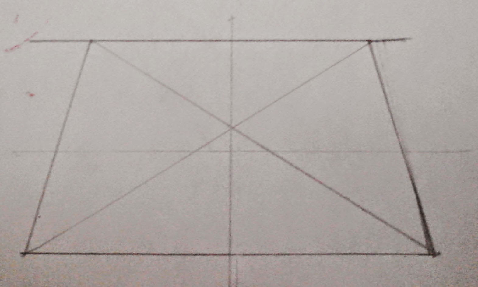 Now comes the perspective portion. You have to find the middle of your trapezoid like shape. A vertical and horizontal cross at this point will not give you the middle and will throw off your perspective. A perfect 'T' cross will give you the middle of a perfect square and circle, which is not our goal or starting shape. The first and most important step is to draw two diagonal lines--an X--in your shape, connecting the corners to each other. That will give you the middle of any variation of this shape.